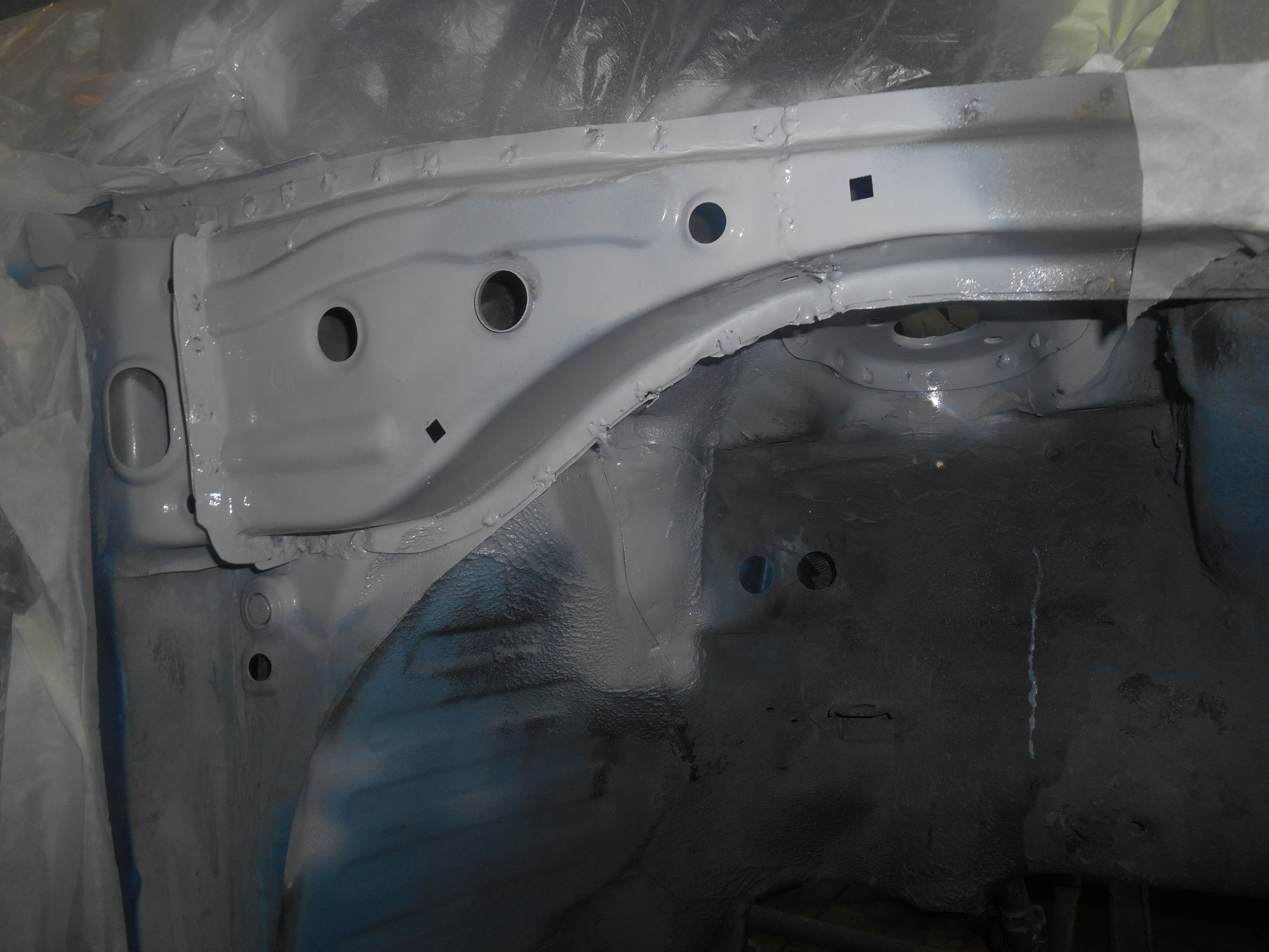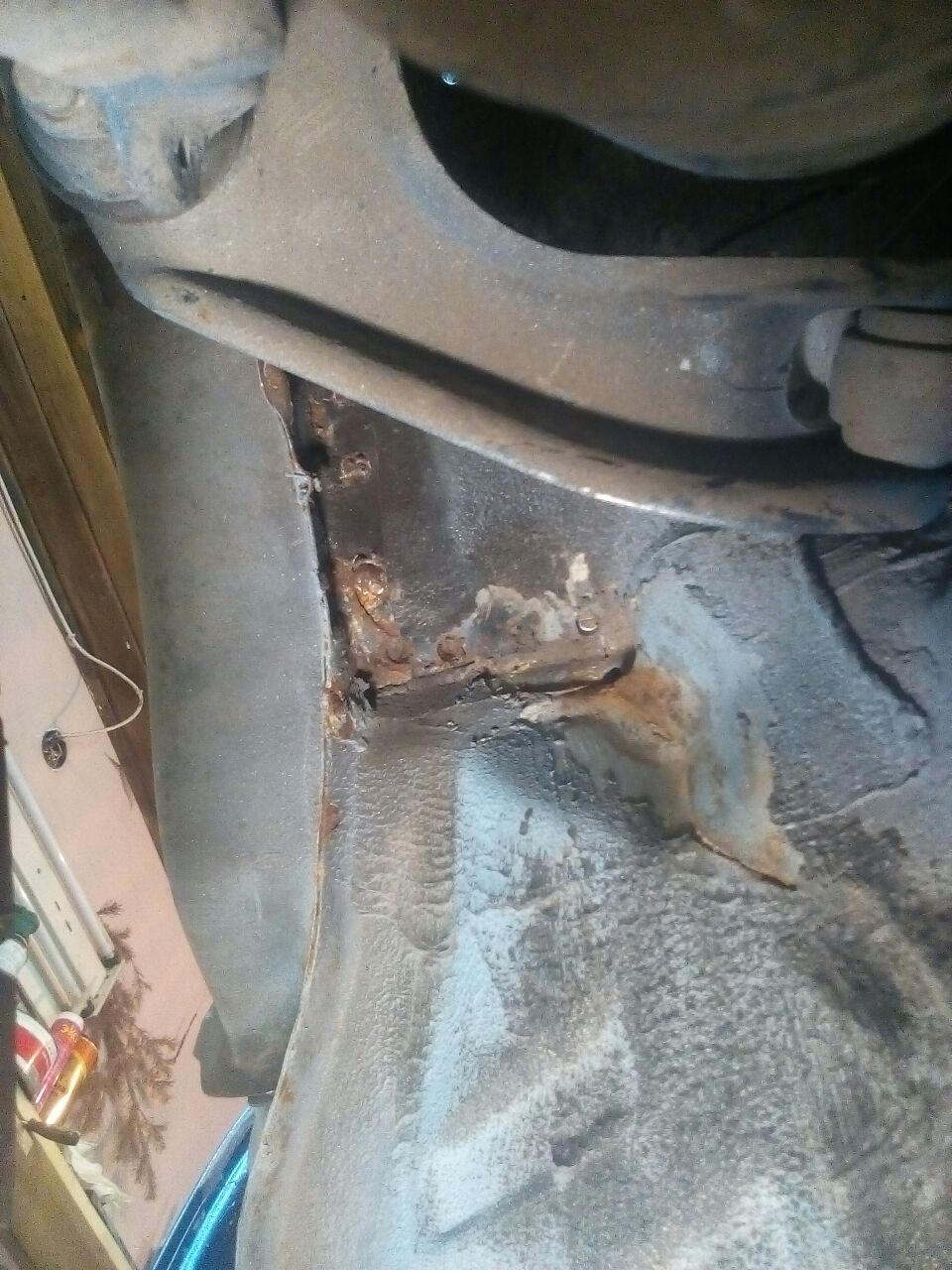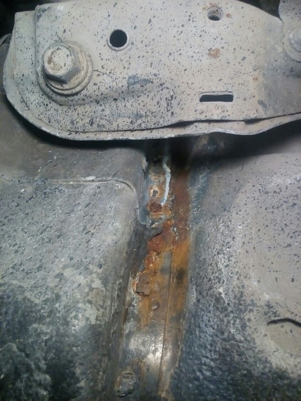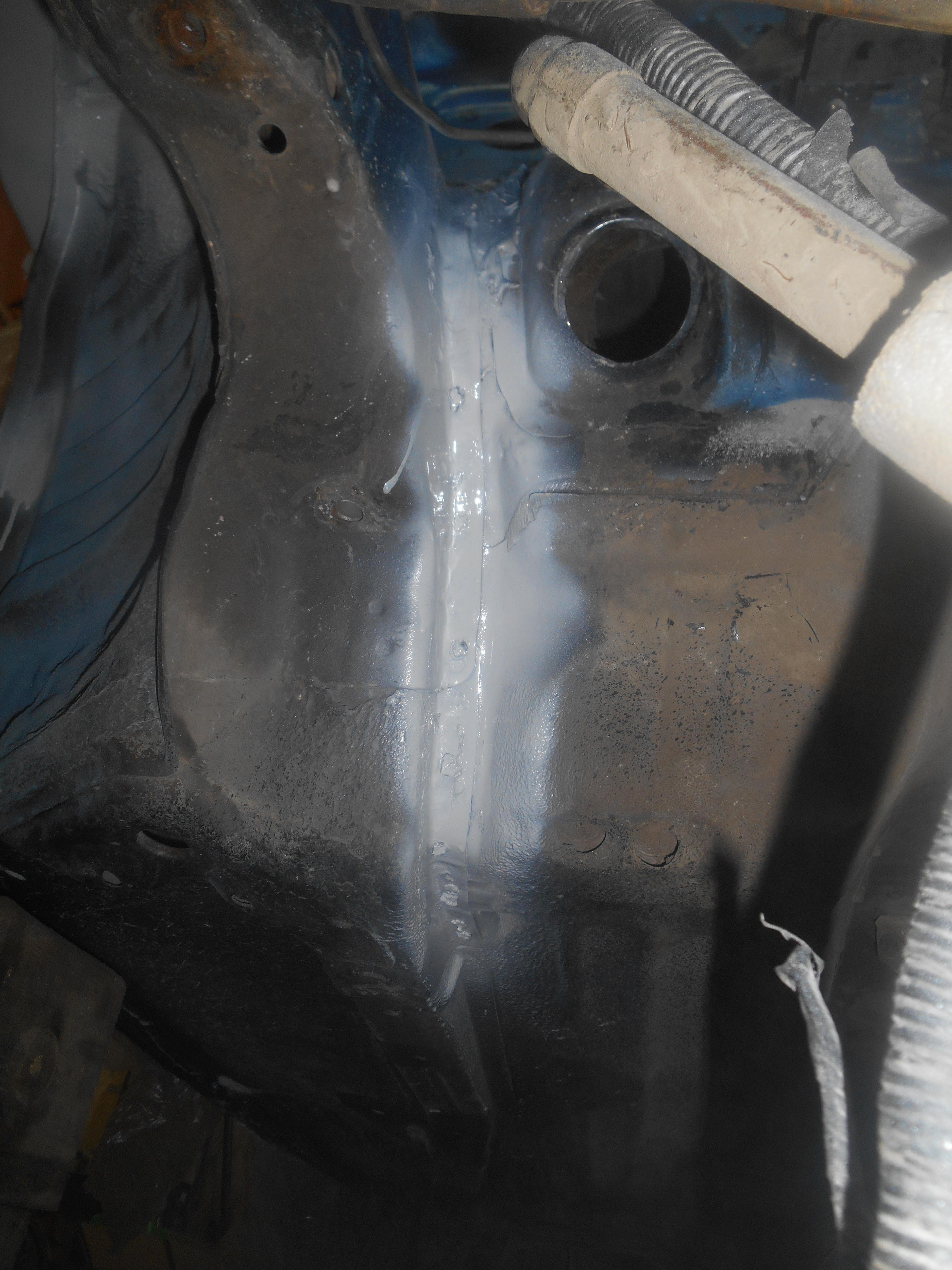 сегодня хотел кое где незаантикоренные места в месте сварки переднего лонжерона зачистить, потом всё это дело задуть эпоксидным грунтом и антигравием. полез вниз и нашел что по быстрому тут никак не уложишься