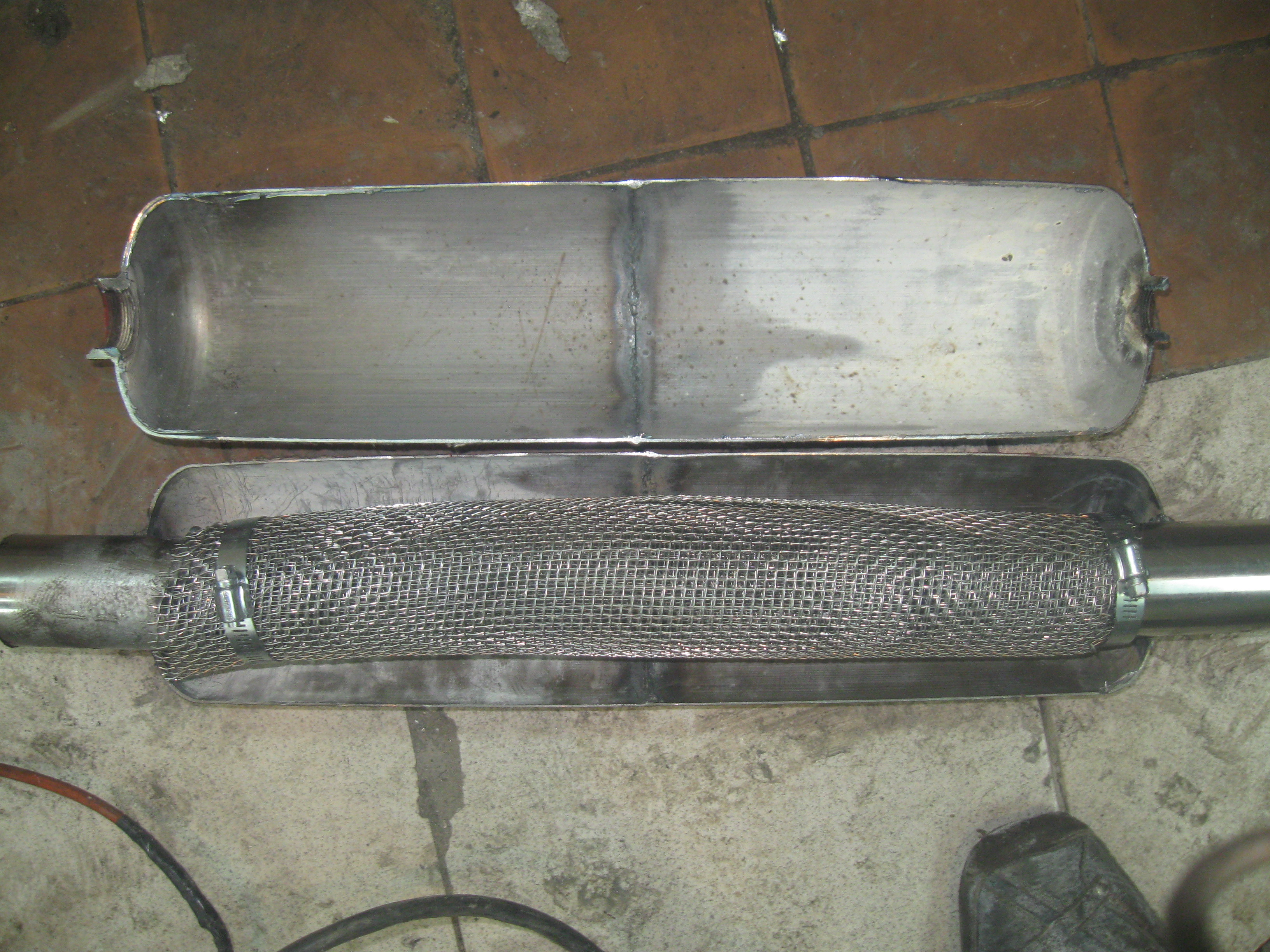 потом отрезаем у огнетушителей донышки приставляем друг к другу, прихватываем сваркой. проверяем что всё ровно и обвариваем шов со всех сторон дальше пилим получившийся баллон повдоль. с торца стачиваем на наждаке полукруг под входную трубу, которое отметили раньше. отрезаем два коротыша из трубы из нержаваейки и ввариваем их в баллон. дальше берем сетку из нержавейки, я взял самую толстую которая была в наличии, 3.5х0.7. сворачиваем её трубой и вставляем её в баллон и фиксируем на входных трубах хомутами. теперь надо гдето достать стекловаты, набить ей резонатор и сварить две половинки.