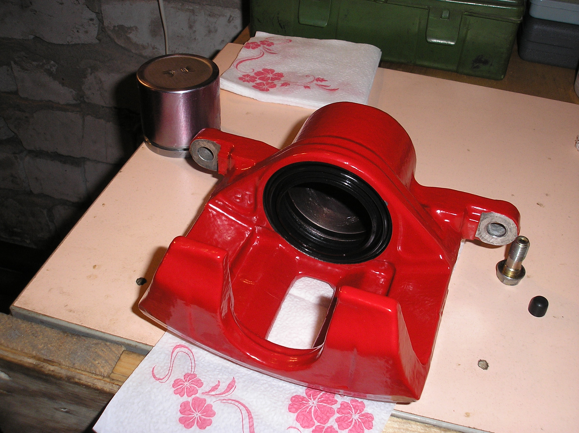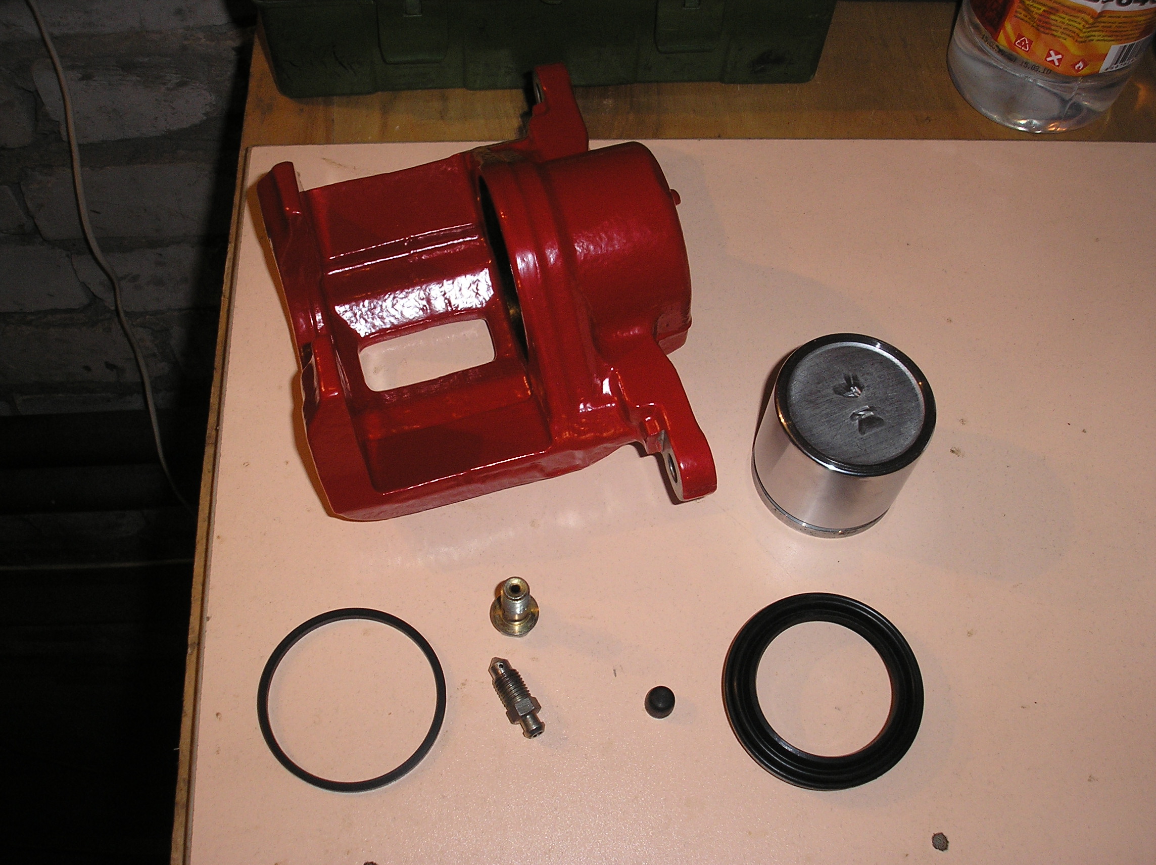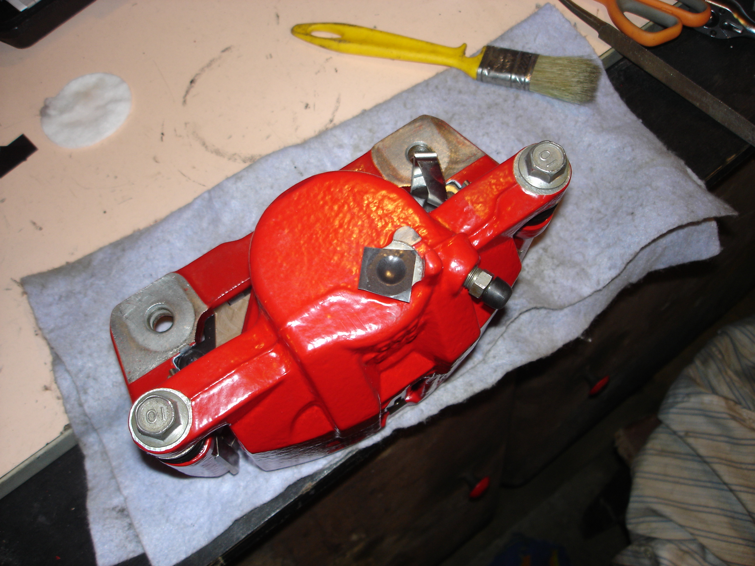 Задняя скоба после ребилда. Резинки пыльников снаружи обработал силиконом, начитался форумов разных. Ну и ага, вслед за передом разобрал я и задние супорты, и перекрасил их тоже