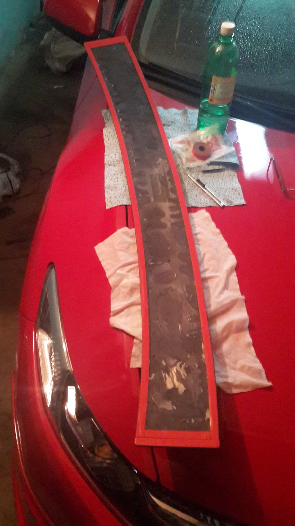 На козырёк клеим "о великай скотче 3М" и предварительно обезжирив стекло усаживаем его на своё родное место