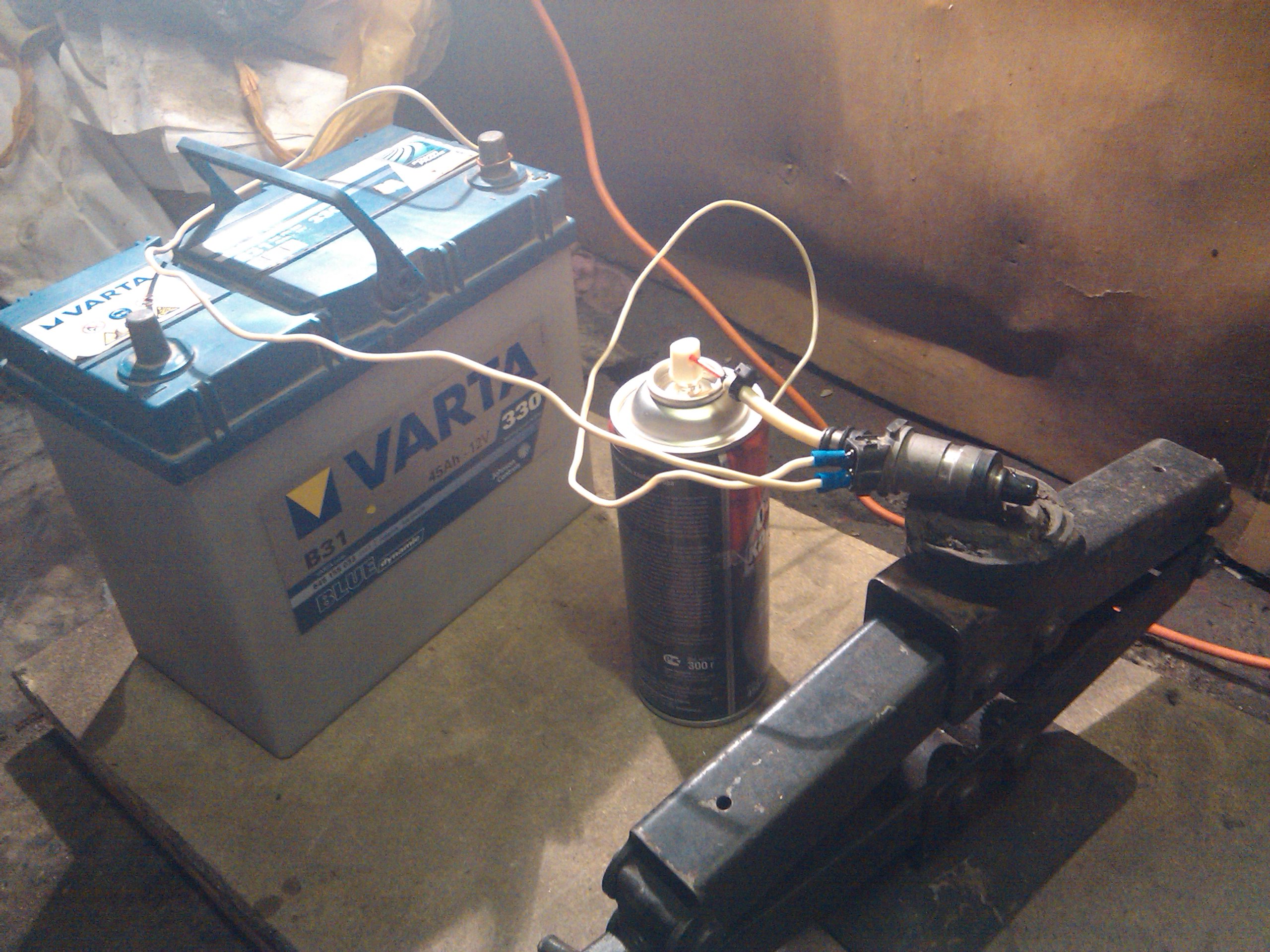 Еще мжду делом, решил прочистить форсунки. Для это нужно приобрести спецжидкость (обязательно спрей с пипкой) для очистки инжектора или карбюратора. С помощью шланга или трубочки соединяем пипку болнчика с форсункой. Соединение должно быть плотным, чтобы создовалось давление. Дальше все просто соединям клемы форсунки с аккумулятором (+к+, -к-). Создаем давление жидкости на форсунку и попеременно начинам замыкать контакт чтобы форсунка открылась. Я делал открыте 5 сек, потом перерыв секунд 5 и т.д. 10 раз. Затем форсунку откладываем и берем следующию. Прогоняем так в два круга.