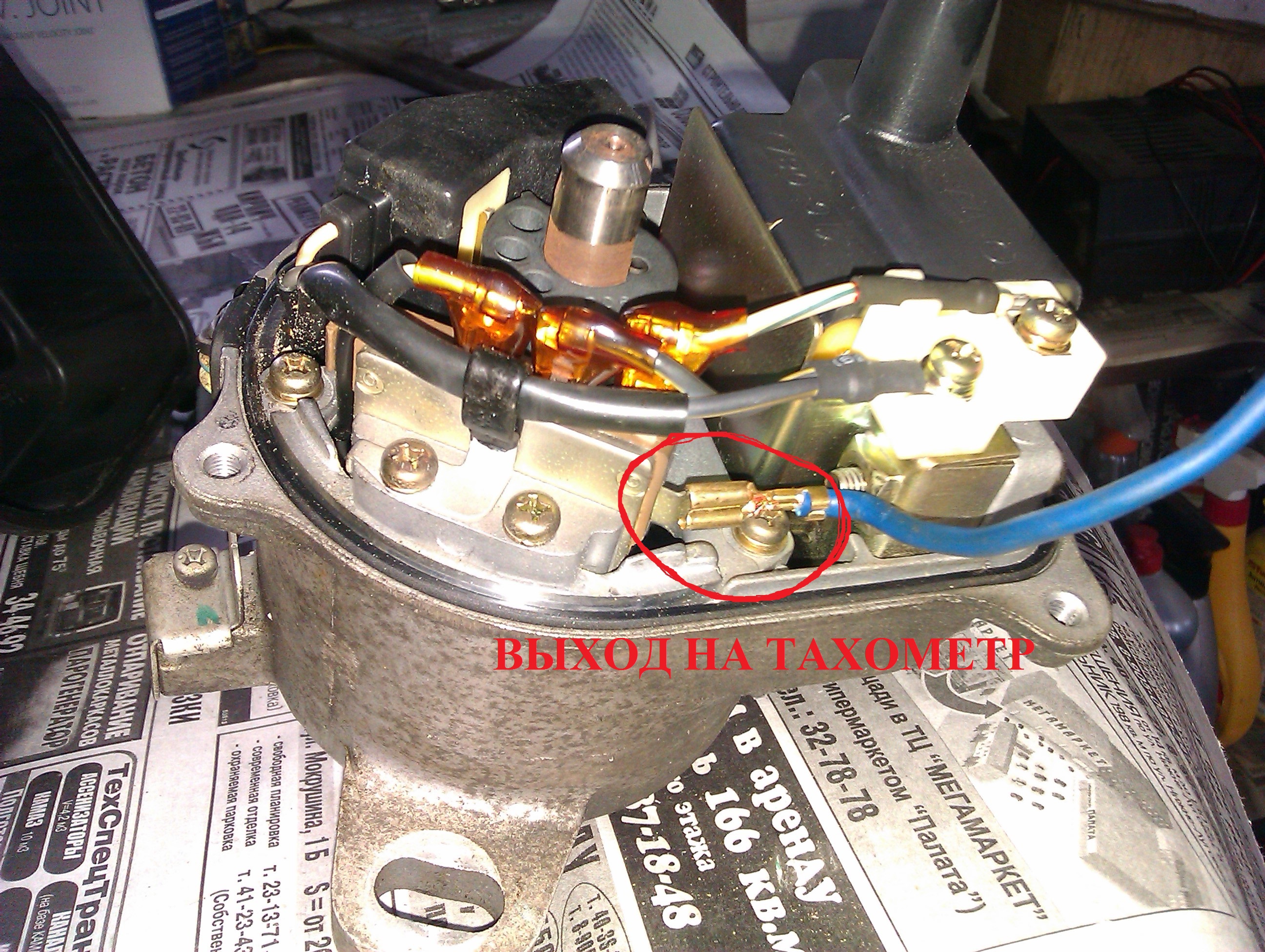 Пока Витя и Ден тут вчера спорили я пытался разобраться в электрических схемах )) Если честно, то я в них ничего не понимаю, но все же полез. В мануле на странице 540 приведена схема приборки из которой даже мне становится понятно, что сигнал на тахометр идет из коммутатора. Там же есть ссылка на схему где этот коммутатор можно найти - схема 6.3, а это оказывается схема трамблера на странице 515. На этой схеме показано, что сигнал идет напрямую к приборке и провод имеет синий цвет. И тут сюрприз - синего провода в доставшемся мне трамблере нету!!! Покурил интеренет и понял, что такие трамблеры бывают. Выход один - сделать такой провод! Сегодня вечером значит разобрал трамблер и пришаманил этот провод, там на коммутаторе оказалась специальная клемма для этого )) В крышке сделал дырочку дрелью, пропустил провод, а потом замазал герметосом. Другой конец провода прилудил к синему проводу из пучка проводов, который находится в правом верхнем углу подкапотного пространства. К описанию прилагаю несколько картинок.