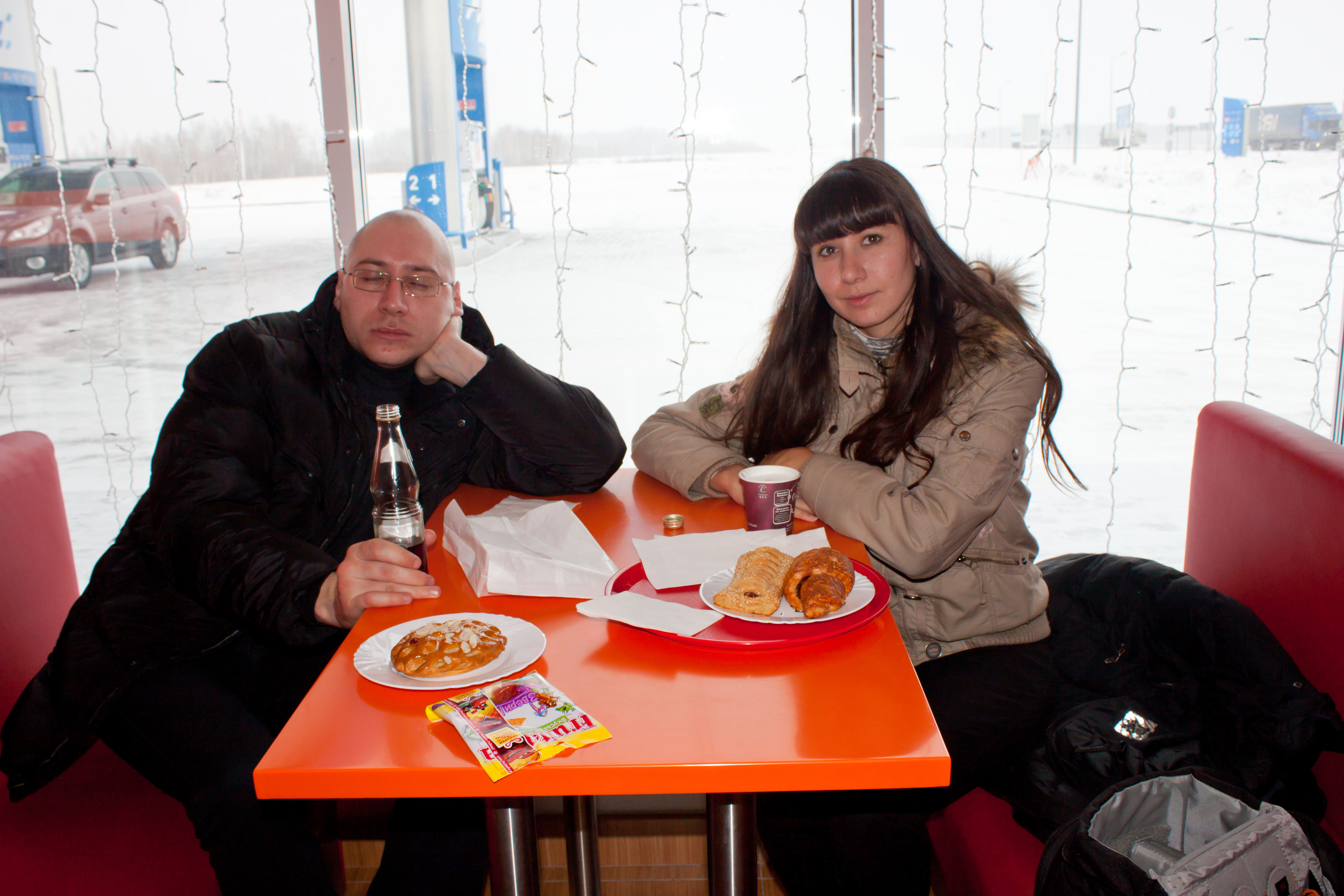 Так же доставляло почти полное отсутствие тормозов (колодки стерлись до металла) и передних стоек. В какой то момент это чуть не закончилось аварией, но в итоге всё обошлось. Ещё выяснилось, что на заправках газпромнефти в Омске божественная выпечка. Трижды останавливались её отведать. Ваня после ночного нонстопа уже не торт. Справа Настя Spree, наш штурман и фотокорр