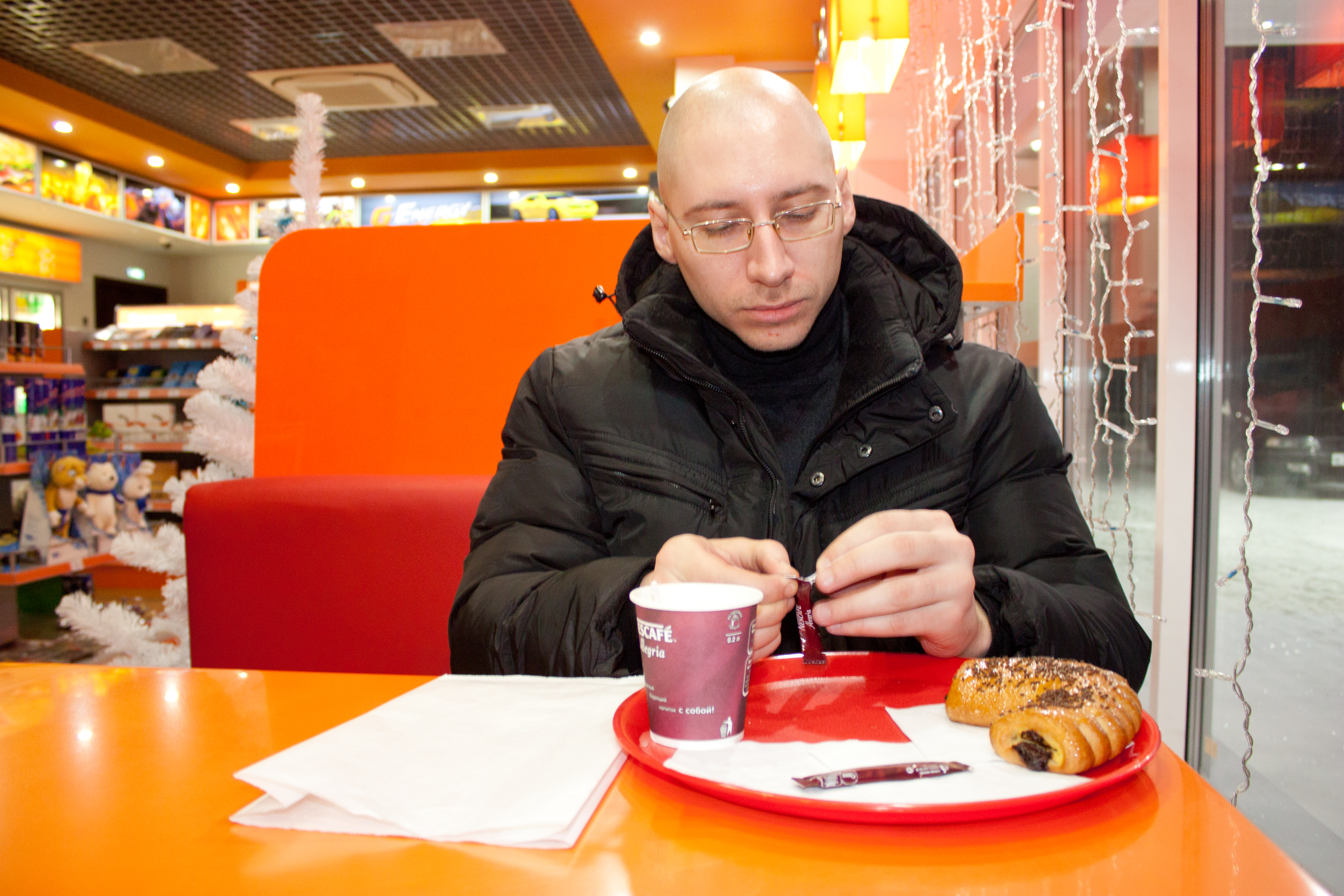 Так же доставляло почти полное отсутствие тормозов (колодки стерлись до металла) и передних стоек. В какой то момент это чуть не закончилось аварией, но в итоге всё обошлось. Ещё выяснилось, что на заправках газпромнефти в Омске божественная выпечка. Трижды останавливались её отведать. Ваня после ночного нонстопа уже не торт. Справа Настя Spree, наш штурман и фотокорр