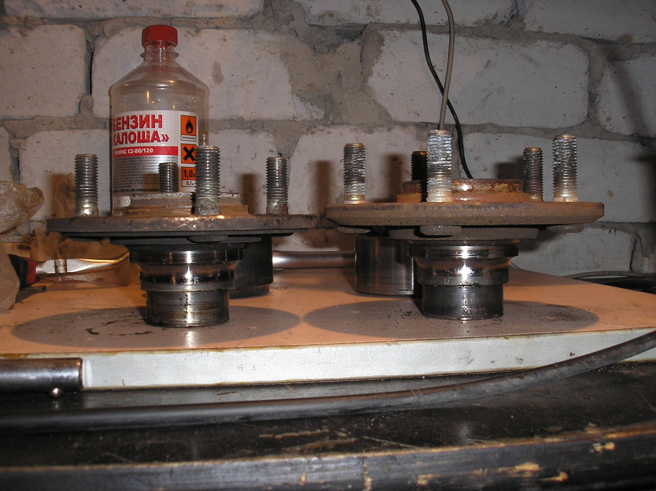Подшипник. Можно было оставить старые, но я решил сразу же поменять все их вкруг. Слева новый ступичный НТН. Он тоже побывал у токаря - сверху убраны разные бортики (56 и 61 мм) и одета втулка на 64 мм. Это диаметр моих новых задних тормозных дисков, ну и всех моих литых дисков тоже. кольцо АБС я снял сам, на время. Снизу токарь тоже немного подровнял подшипник, сделав там вместо конуса цилиндр.