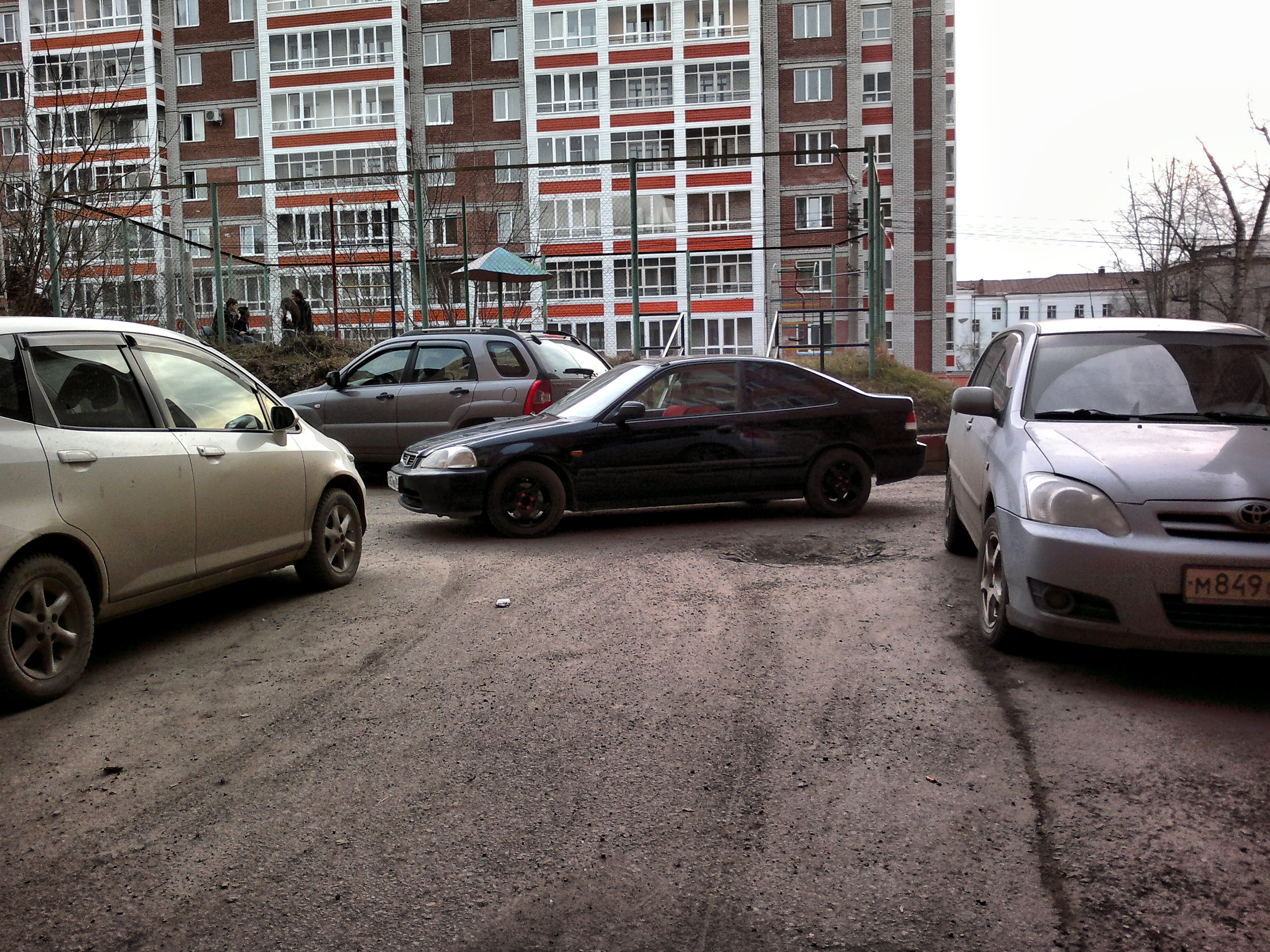 Состояние машины скажем так среднее: железо в хорошем состоянии, но ЛКП хреновое, много где вмятинок по кузову. Подвеска почти живая, но надо ребилдить задние тормоза либо на дисковые, либо приводить в порядок барабанные, и застучал сайлентблок. =:) Двигатель, уже год как ездит на последнем издыхании и ждет когда же его заменят на двухлитровый. Салон, сзади в идеале, спереди надо перетягивать. Плюс на цивикклабе кинули с свапом на электроподъемники, поэтому до сих пор на веслах.