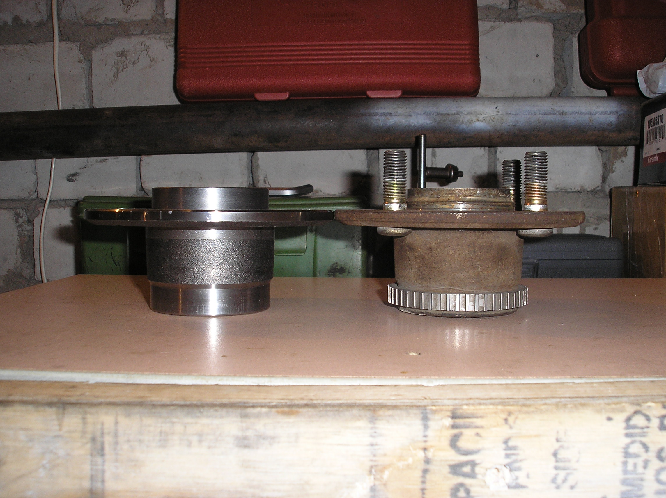 Подшипник. Можно было оставить старые, но я решил сразу же поменять все их вкруг. Слева новый ступичный НТН. Он тоже побывал у токаря - сверху убраны разные бортики (56 и 61 мм) и одета втулка на 64 мм. Это диаметр моих новых задних тормозных дисков, ну и всех моих литых дисков тоже. кольцо АБС я снял сам, на время. Снизу токарь тоже немного подровнял подшипник, сделав там вместо конуса цилиндр.